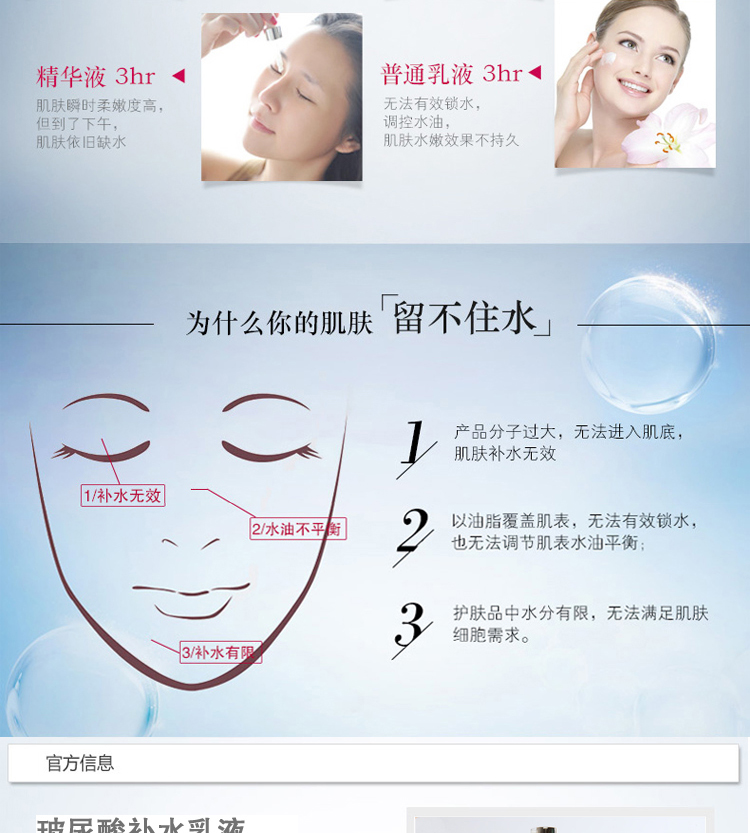 特別添加玻尿酸補(bǔ)水成分,時(shí)間為干涸缺水的肌膚注入水活生命力,并24小時(shí)鎖住水分。可持續(xù)強(qiáng)化肌膚的天然保濕屏障,注入年輕活力,幫助肌膚長時(shí)間保持自身水分。肌膚從此盡顯水潤光彩,更易抵御歲月痕跡。它將給你帶來全天候的滋潤感覺,無油膩配方,連“痘痘”皮膚也可安心使用,被稱之為“皮膚的甘露”。自然清新不油膩,能喚醒皮膚制造適量水分及改善皮膚天然滋潤保護(hù)膜,以提供給皮膚好的“保濕飲料”。